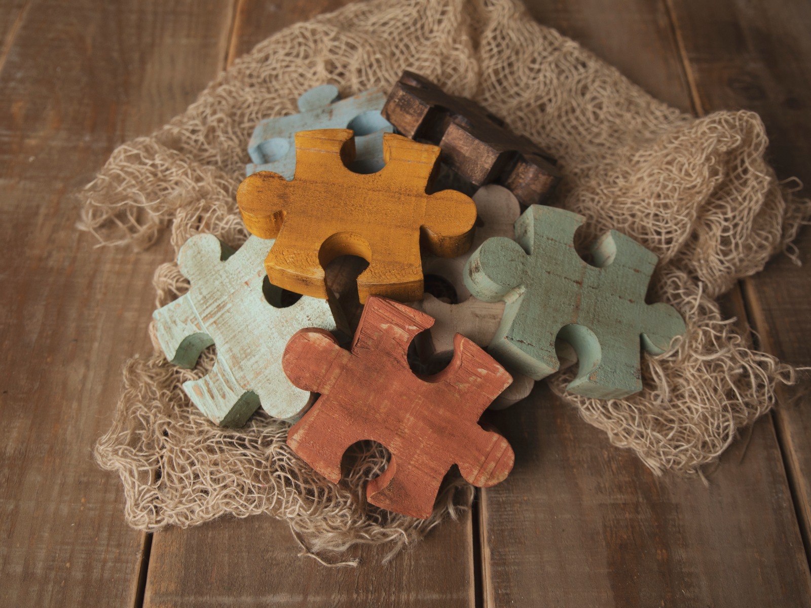 Piezas de puzzle de aproximadamente 10 x 10 cm trabajadas y pintadas a mano en madera maciza