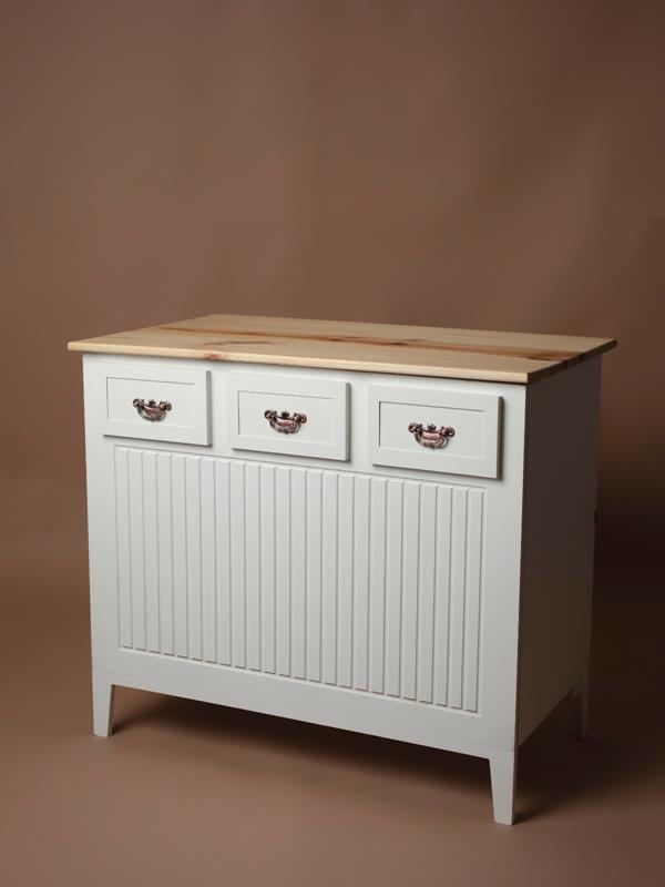 Mueble plegable completamente artesanal esmaltado en blanco y con la tapa de madera maciza natural tratada con aceite