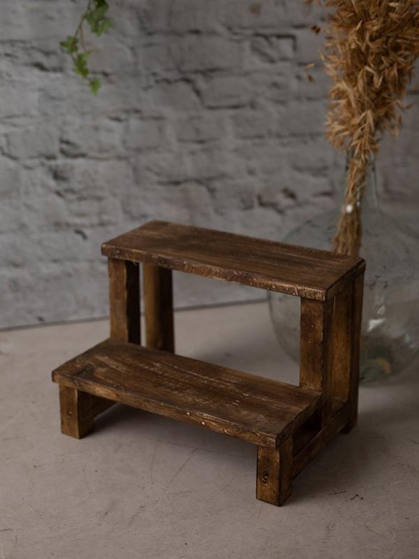 Descubre nuestra encantadora escalera de madera maciza de dos peldaños, diseñada especialmente para aportar un toque único y versátil a tus sesiones fotográficas infantiles. Su estructura presenta un primer peldaño cercano al suelo, ideal para los más pequeños, y un segundo peldaño con mayor altura, perfecto para crear diferentes niveles en la composición de tus imágenes.