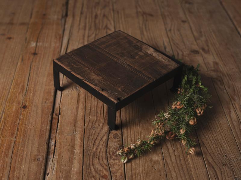 Mesita forjada a mano y acabada con madera de derribo , se presenta con acabado envejecido  y un estado de acabado perfecto